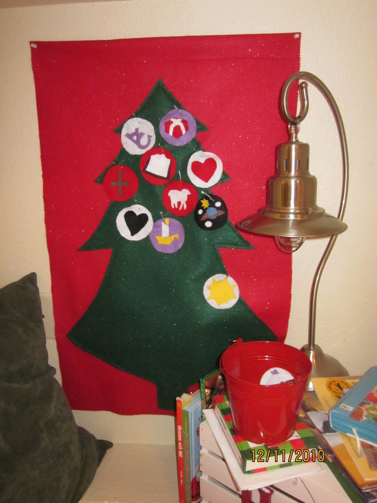 Oma made us a very cool Advent Tree this year. Everyday we read a small devotional and then find the correct symbol to put on the tree. We do this every night at dinner and the kids have been loving it. They take turns being in charge of the symbols. It has created some great family time at dinner. My favorite part about it has been watching Andrew. He discovered his kids BIBLE that we got him for his 2nd Birthday. He can now find the books of the Bible and then the chapter and verse. He reads the verse every night and then always finds the verse for the next day. It has been so neat to see him be so interested in reading his Bible. He sat by the fire the other night just reading his Bible. Thanks Oma for the very cool gift...we have been enjoying it tremendously!!